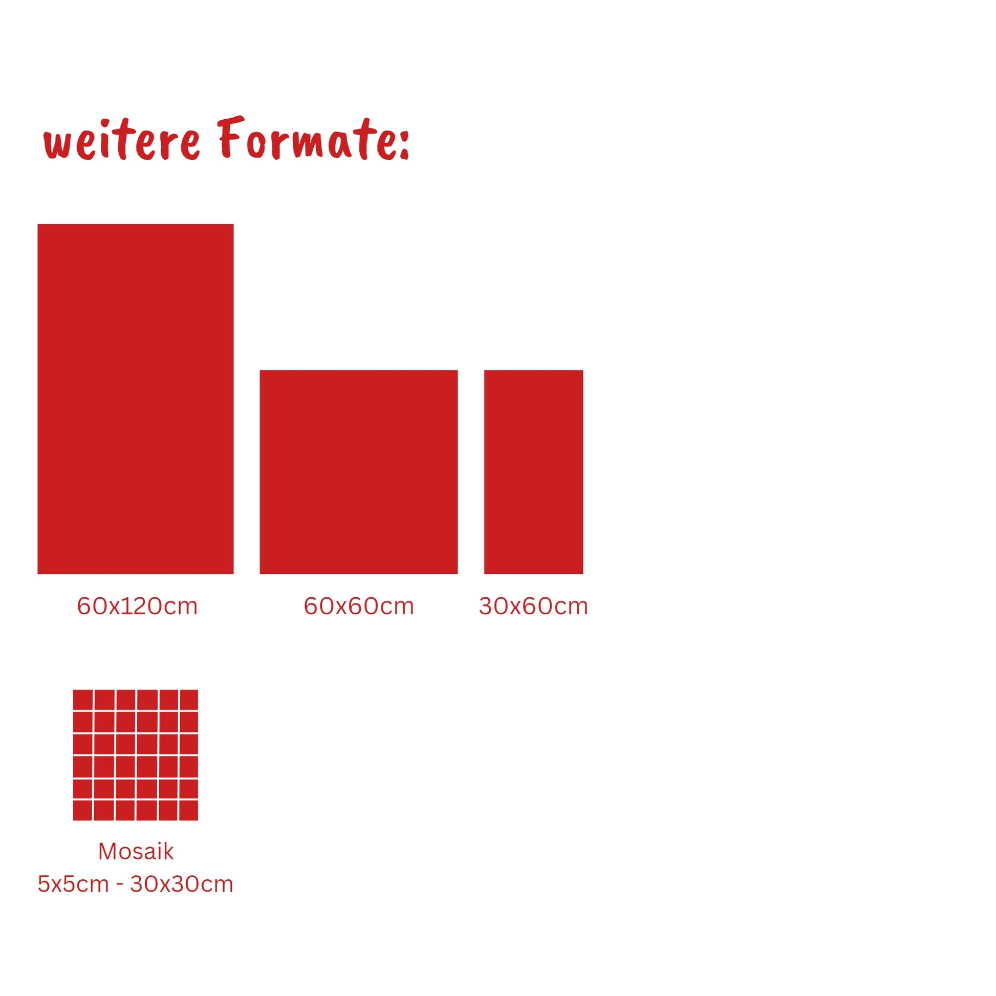 Musterfliesen werden grundsätzlich maximal bis zum Format 60/60cm verschickt. In Einzelfällen und bei Nichtverfügbarkeit der Größe werden Musterfliesen auch in einem anderen Format verschickt. Optik, Farbe und Oberfläche entsprechen hierbei aber dem eigentlich bestellten Muster. Fliesen im Format 20x120cm oder 30x120cm werden zu je zwei Hälften verpackt, sodass diese durch Zusammenlegen das Originalformat ergeben.